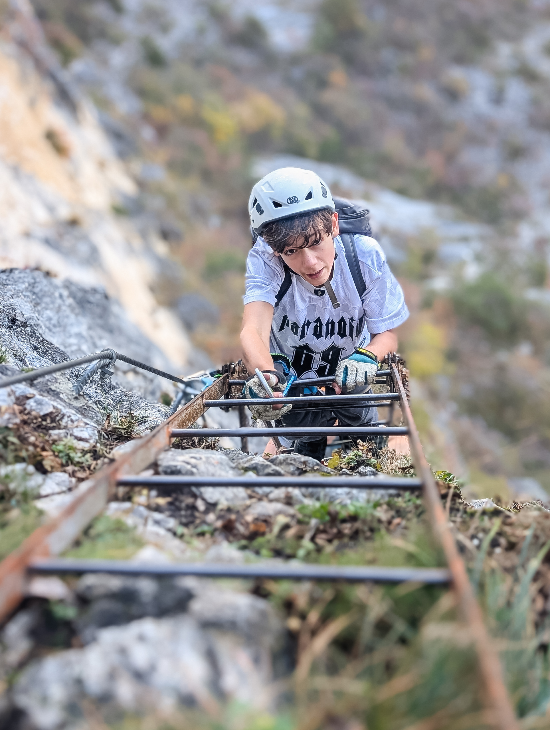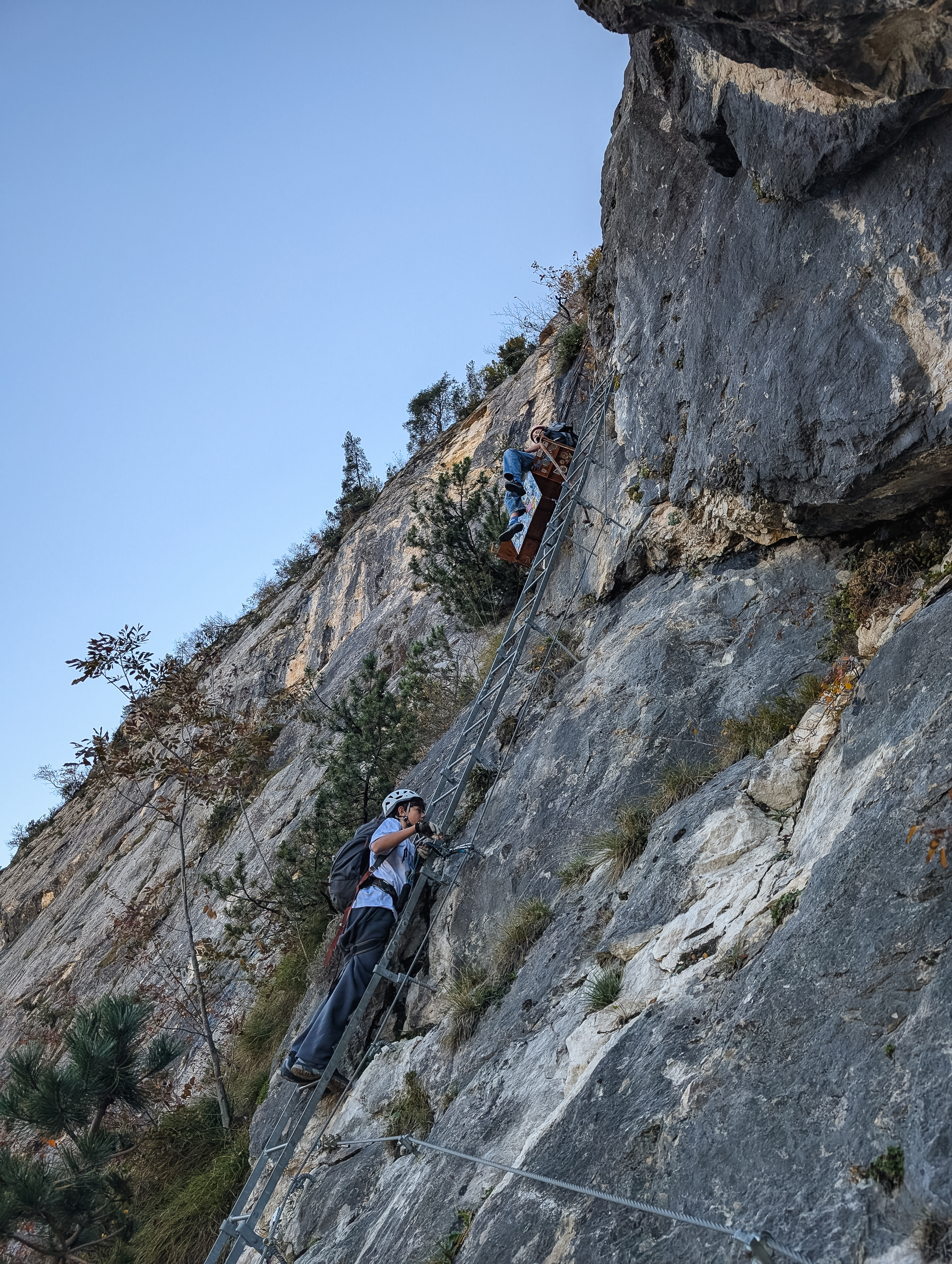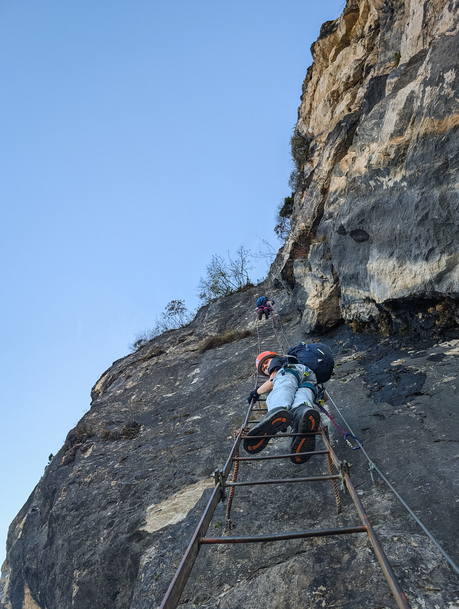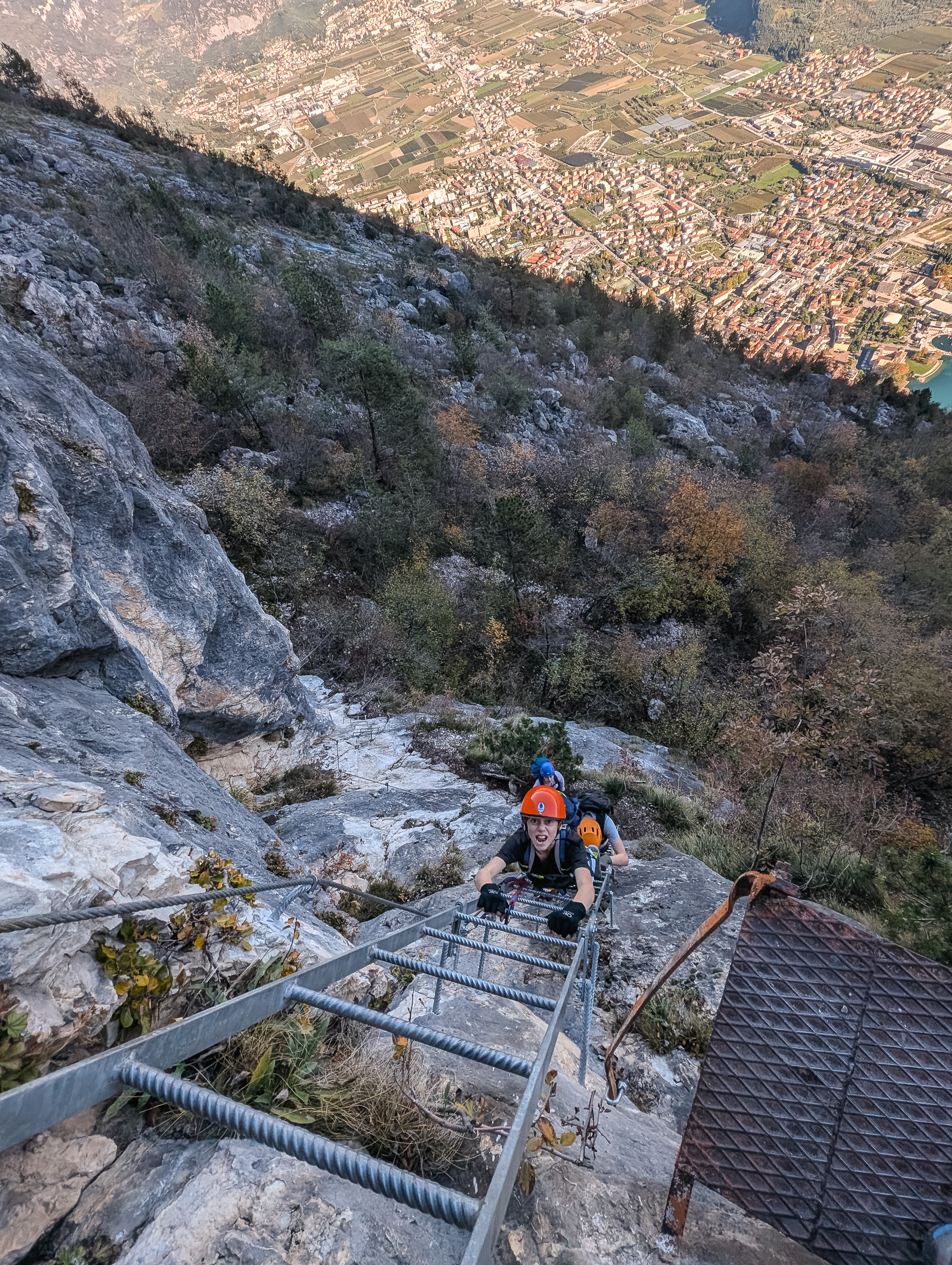 Weil das Wetter auf der Alpennordseite überall schlecht ist, verlegen wir unser Tourenziel spontan zum Gardasee. Dort biwakierten wir in den Bergen, gehen Klettersteige, essen Pizza und feiern Geburtstag. Highlight der Tour ist der Klettersteig „Via dell‘Amicizia“ auf die Cima SAT mit seinen vielen langen und ausgesetzten Leitern und Blick hinunter auf den See.